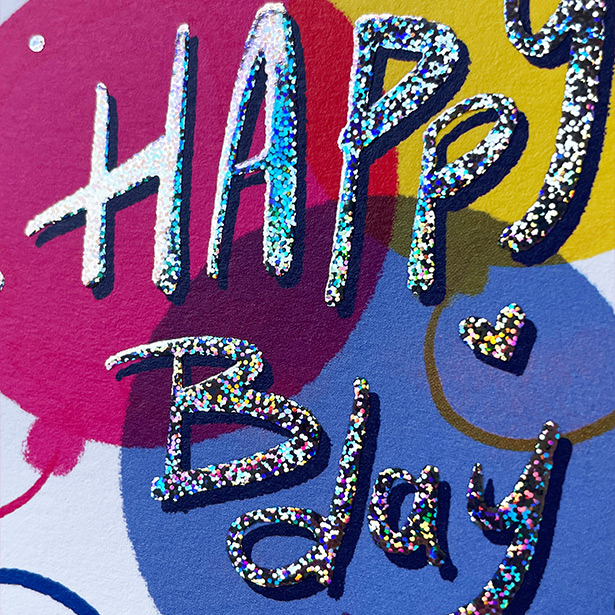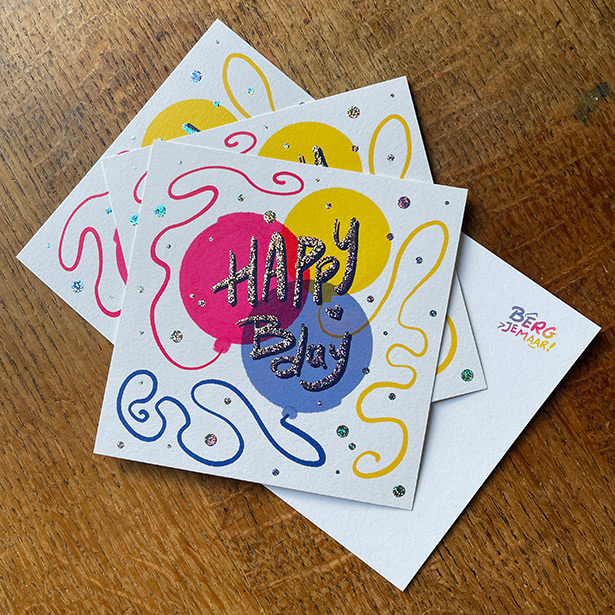 Een feestelijke verjaardagskaart met ballonnen en een glitterende verjaardagsgroet.